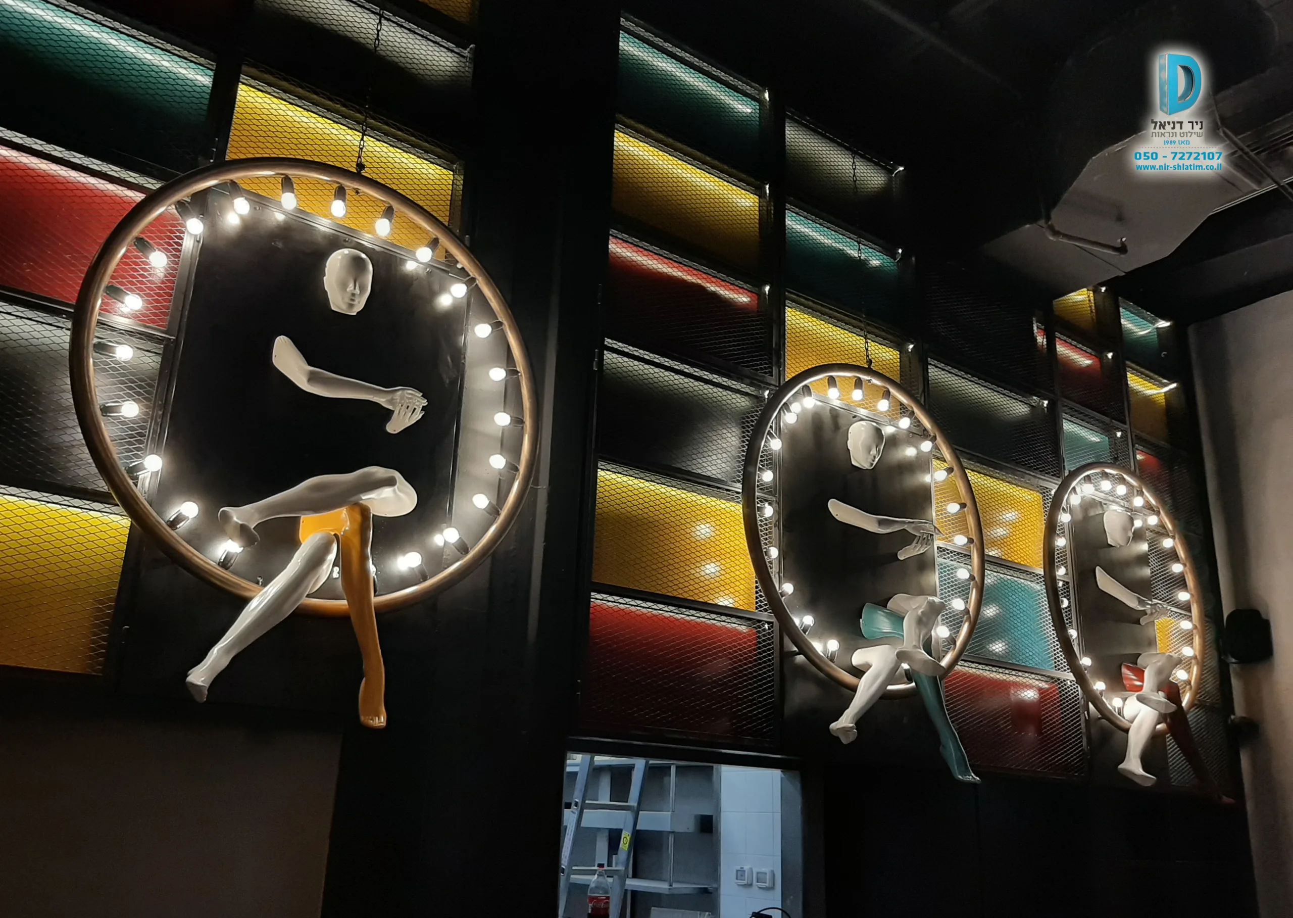 ייצור האלמטים תוך שימוש בחמרים מקוריים כגון בובת ראווה, ערגול מתכות, עץ, פרספקס ועוד...